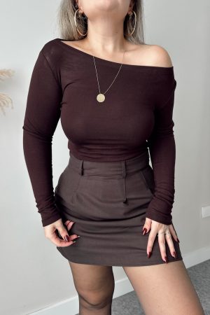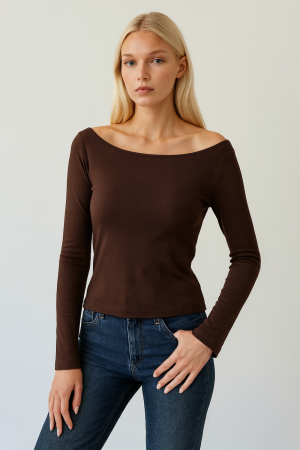 Kahve Sandy Kayık Yaka Crop Bluz