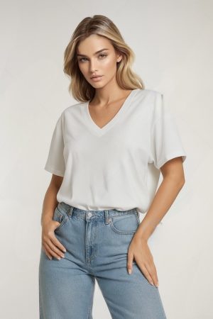 Ekru V Yaka Çelik Premium Oversize Tshirt