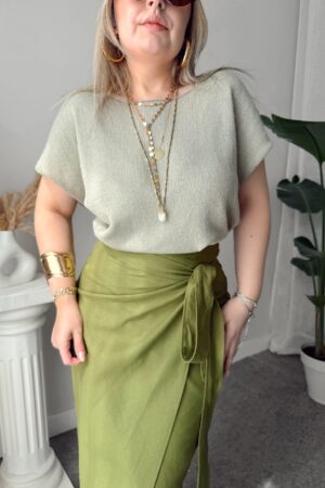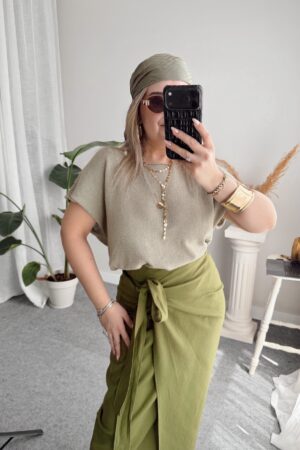 Haki Pamuk Yarasa Kol Crop Merserize Bluz