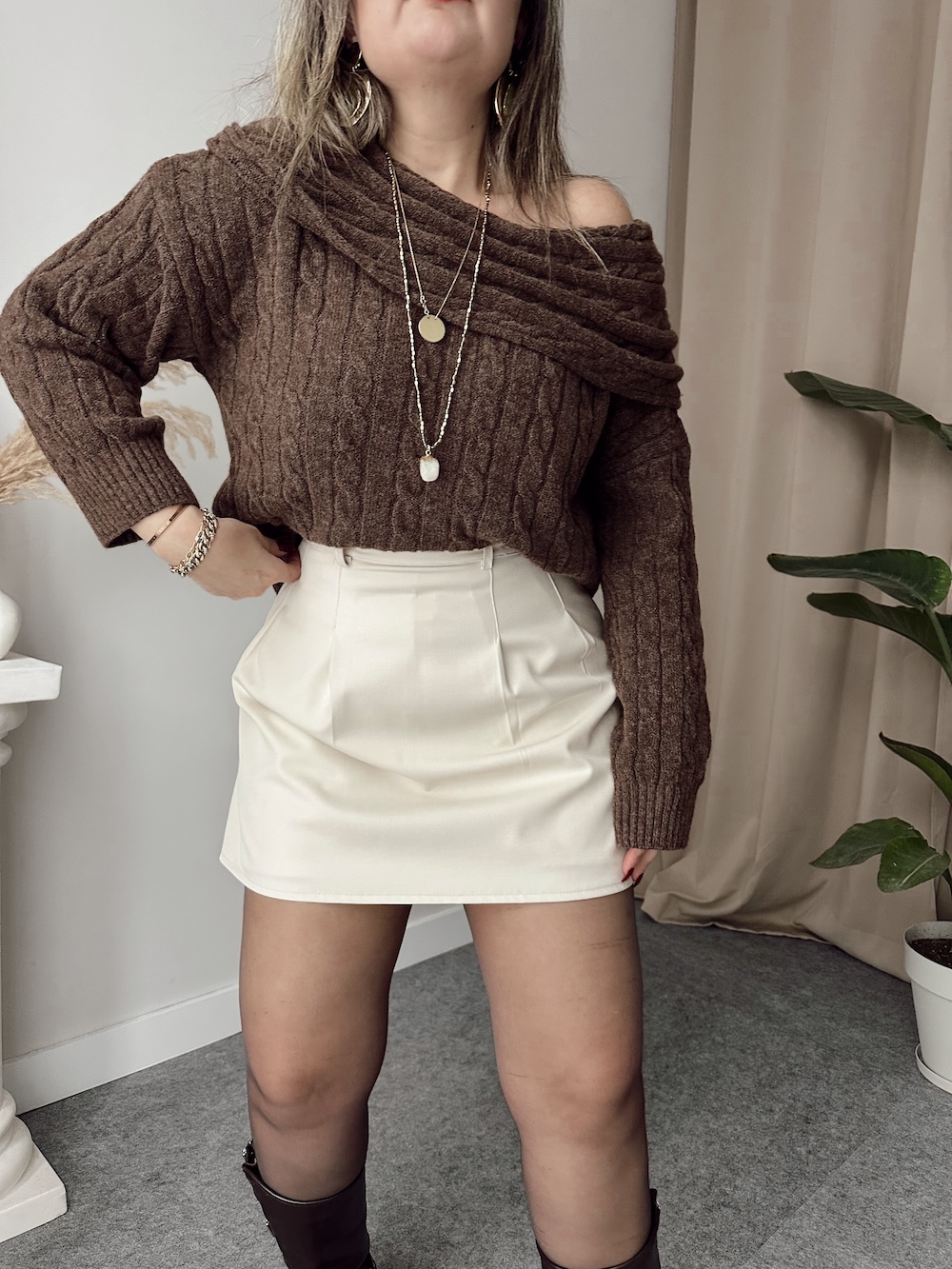 Kahve Kayık Yaka Saç Örgü Kazak