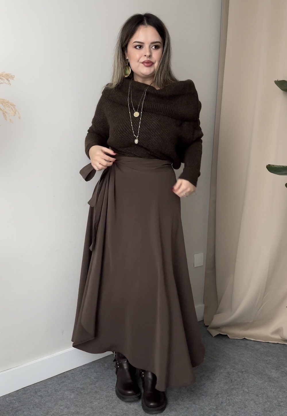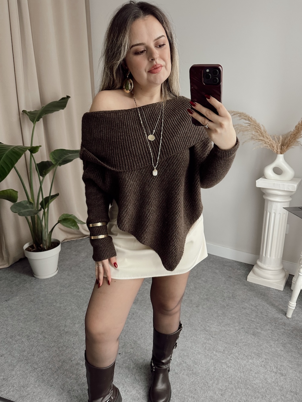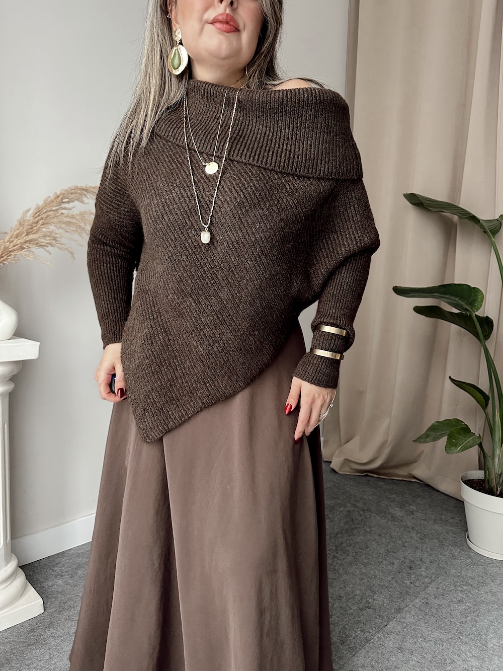 Kahve Kayık Yaka Saç Örgü Kazak