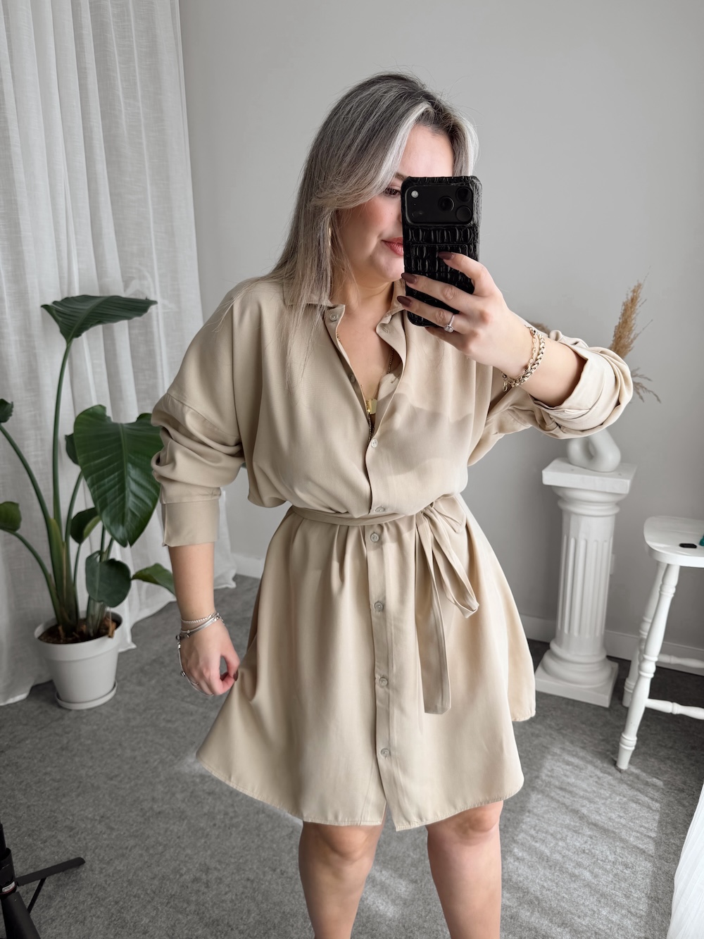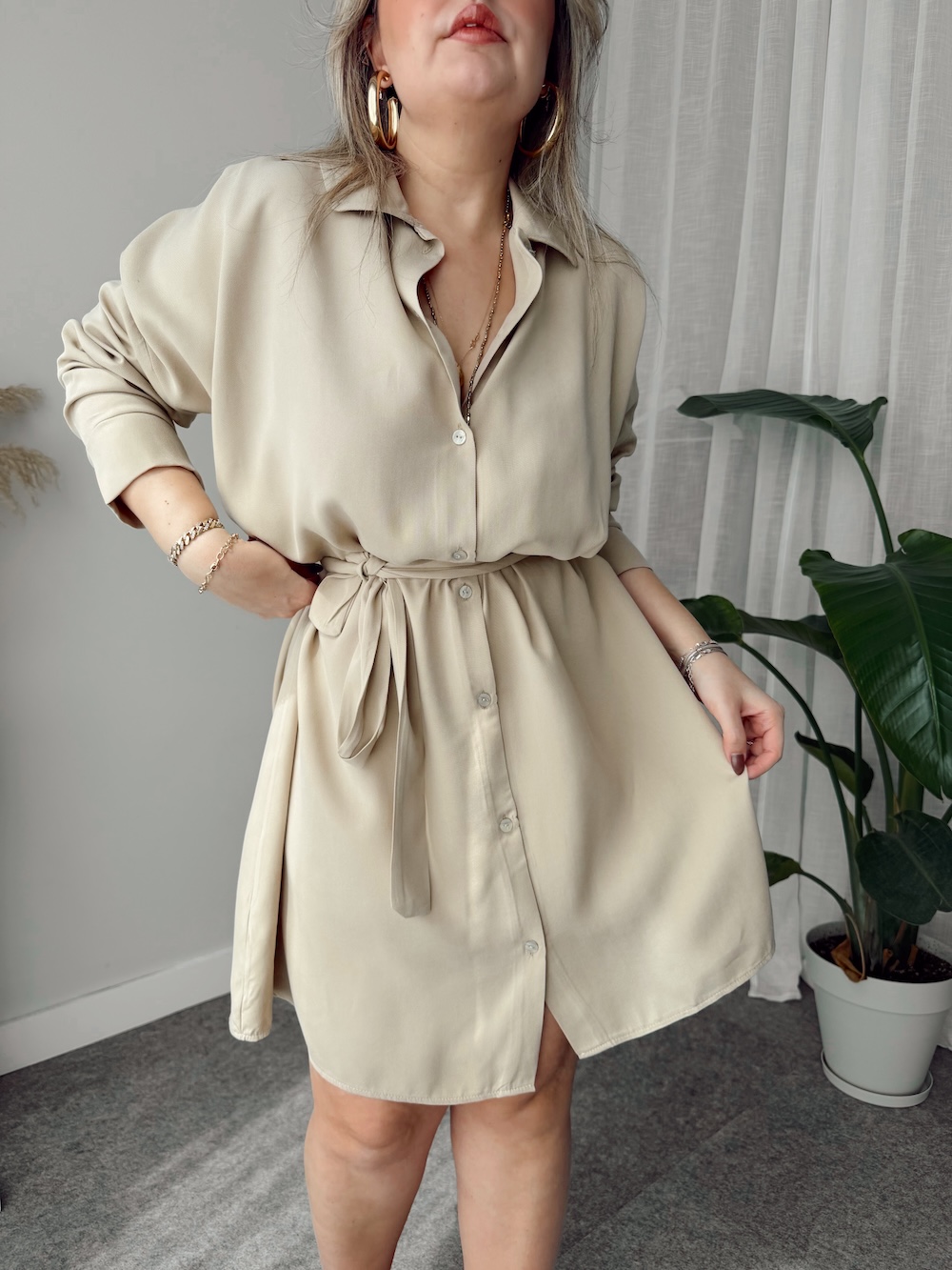 Bej Premium Tensel Gömlek Elbise