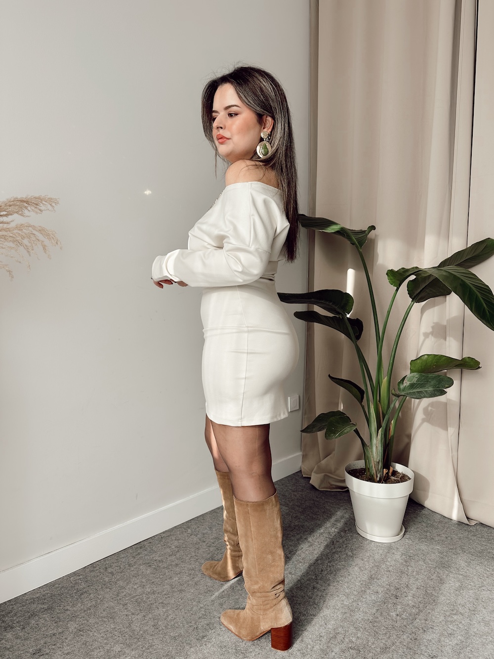 Krem Çelik Kayık Yaka Mini Elbise
