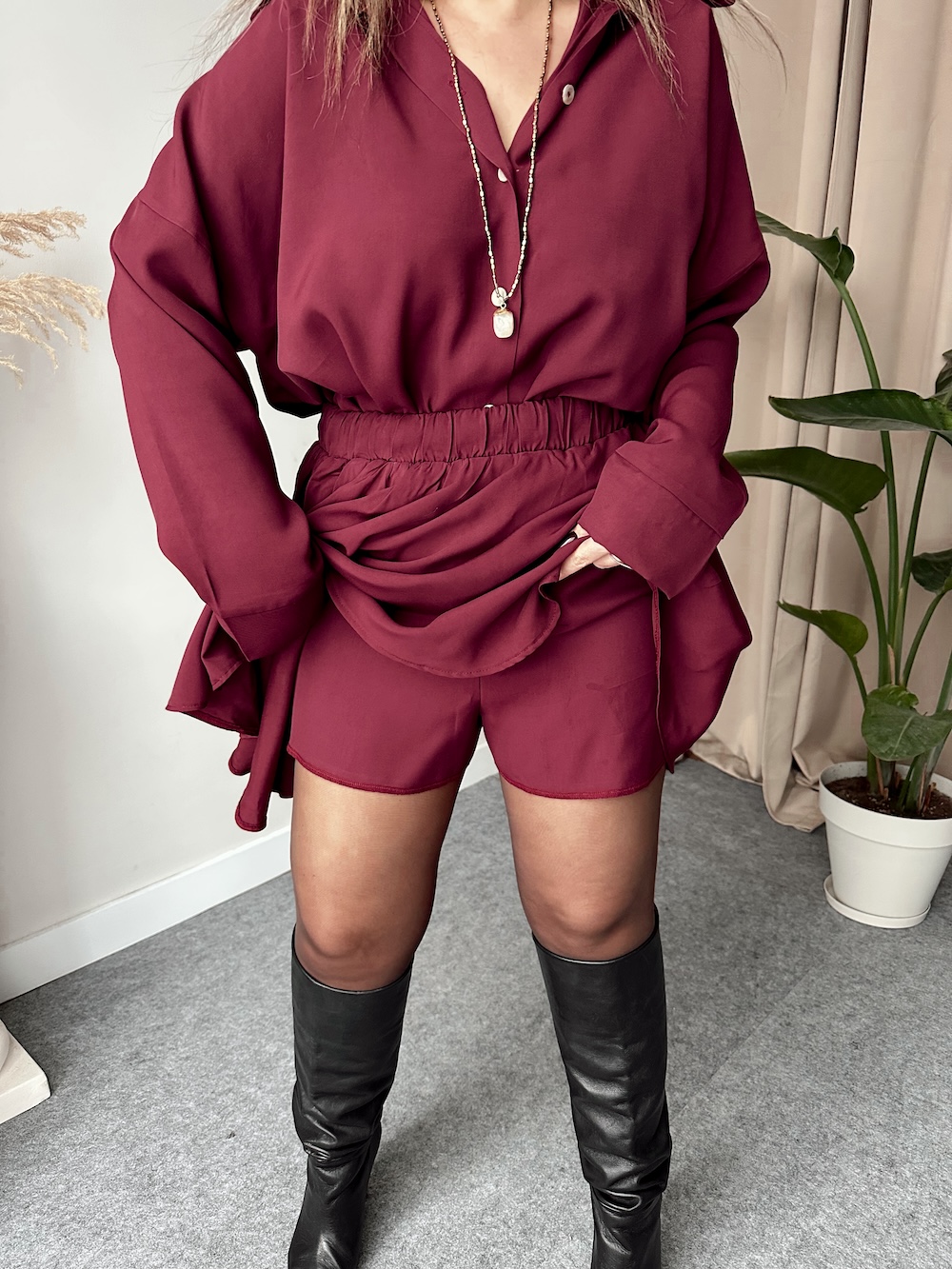 içinde kendi kumaşından geniş kesim şortu mevcuttur.