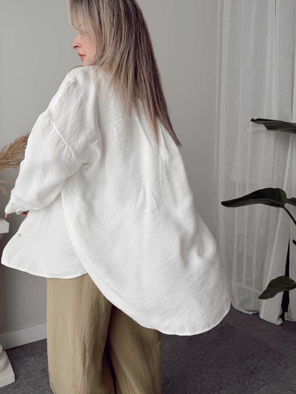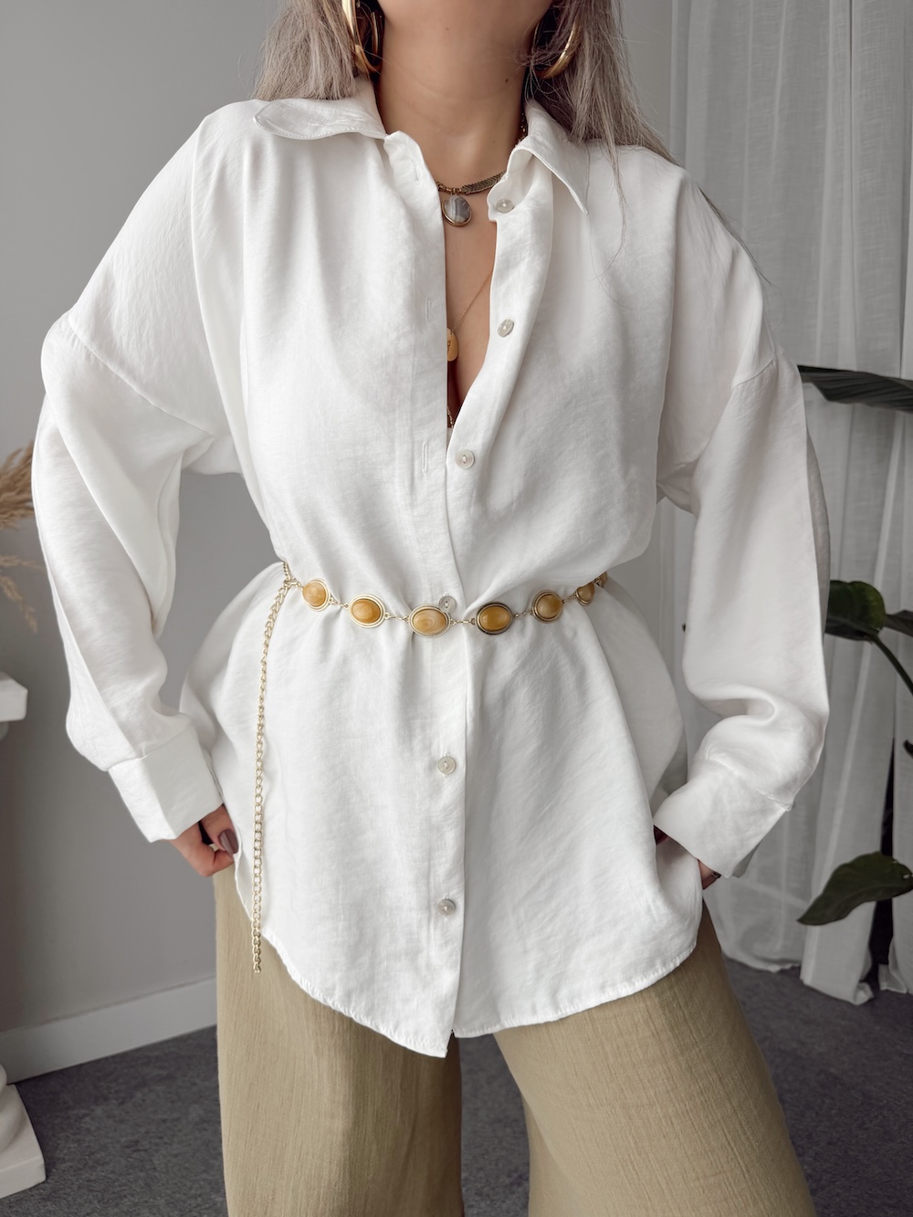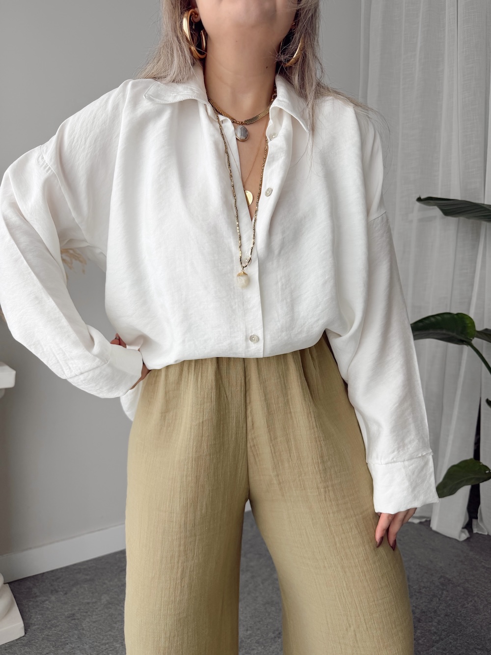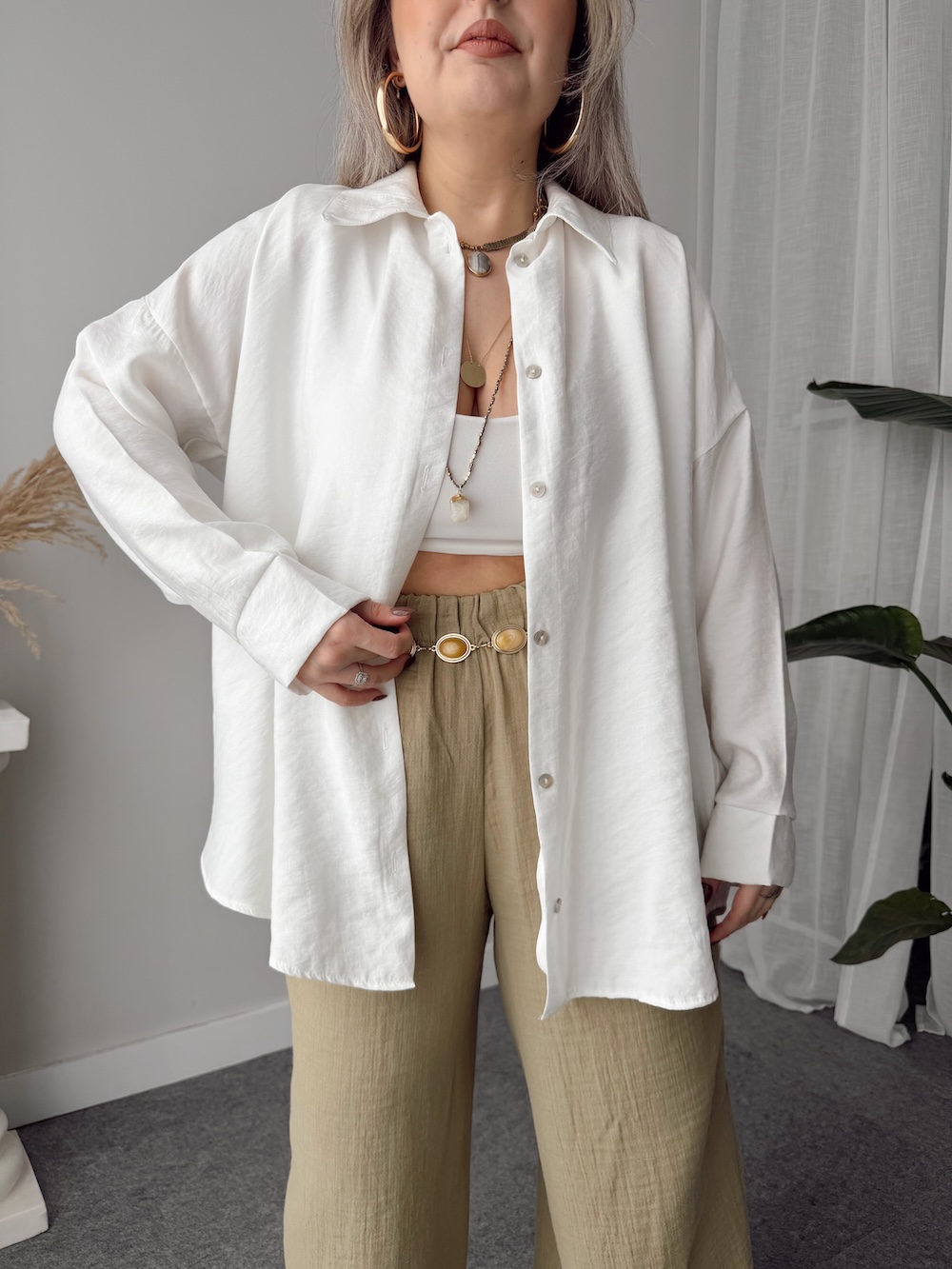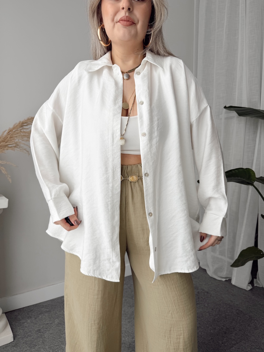 Ekru Soft Modal Krinkıllı Oversize Gömlek