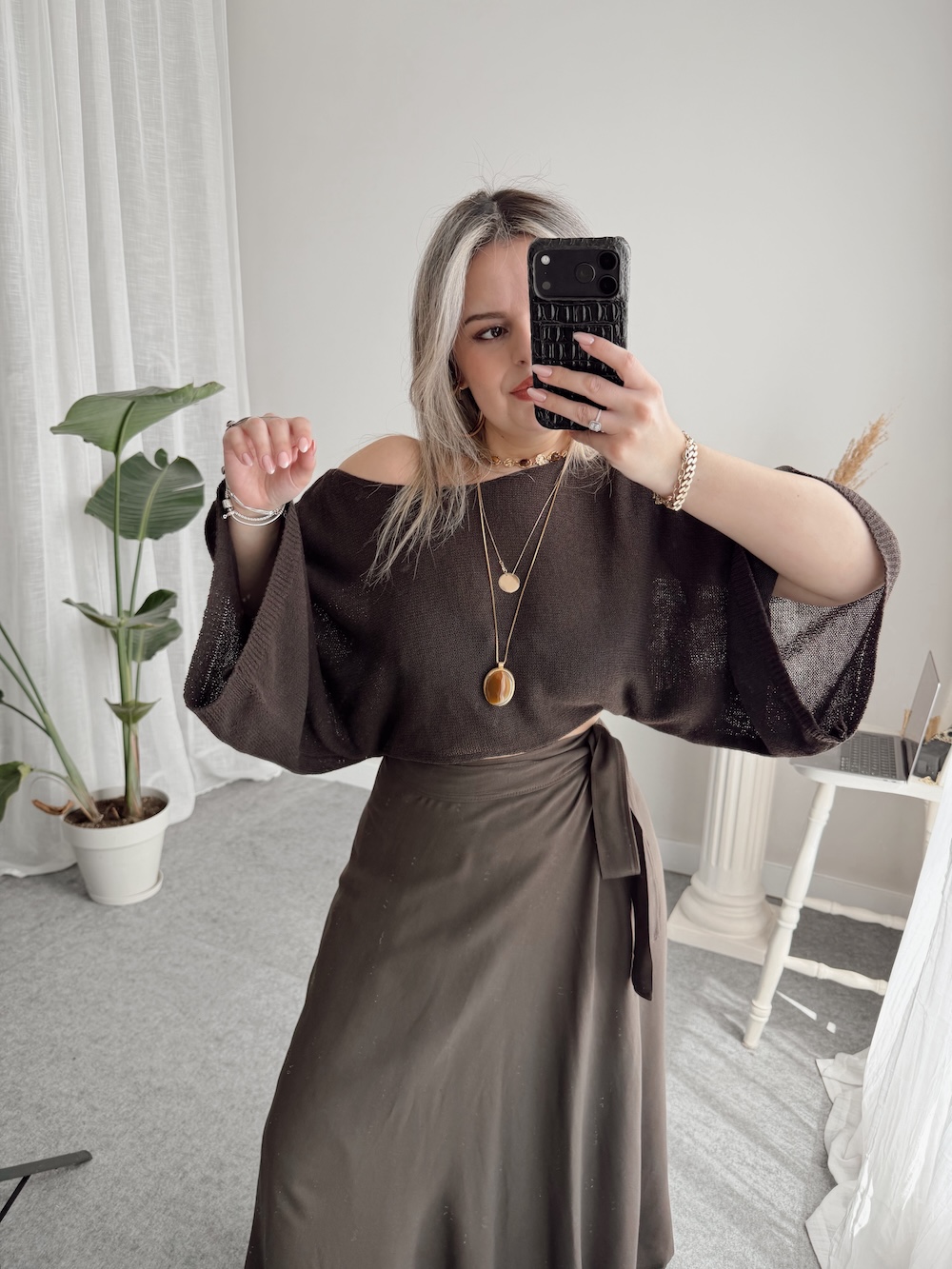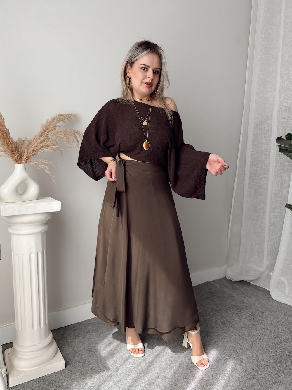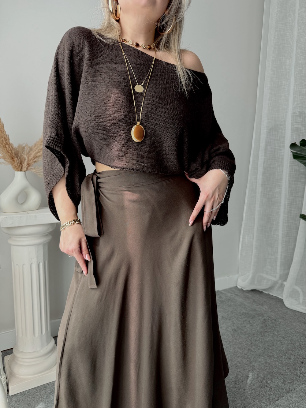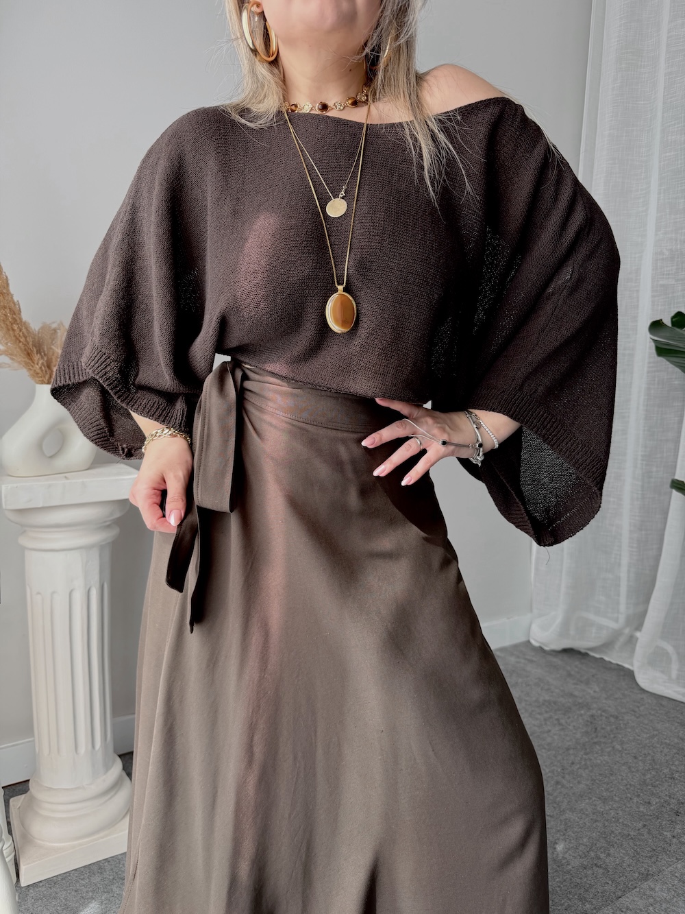 Kahve Pamuk Yarasa Kol Crop Merserize Bluz