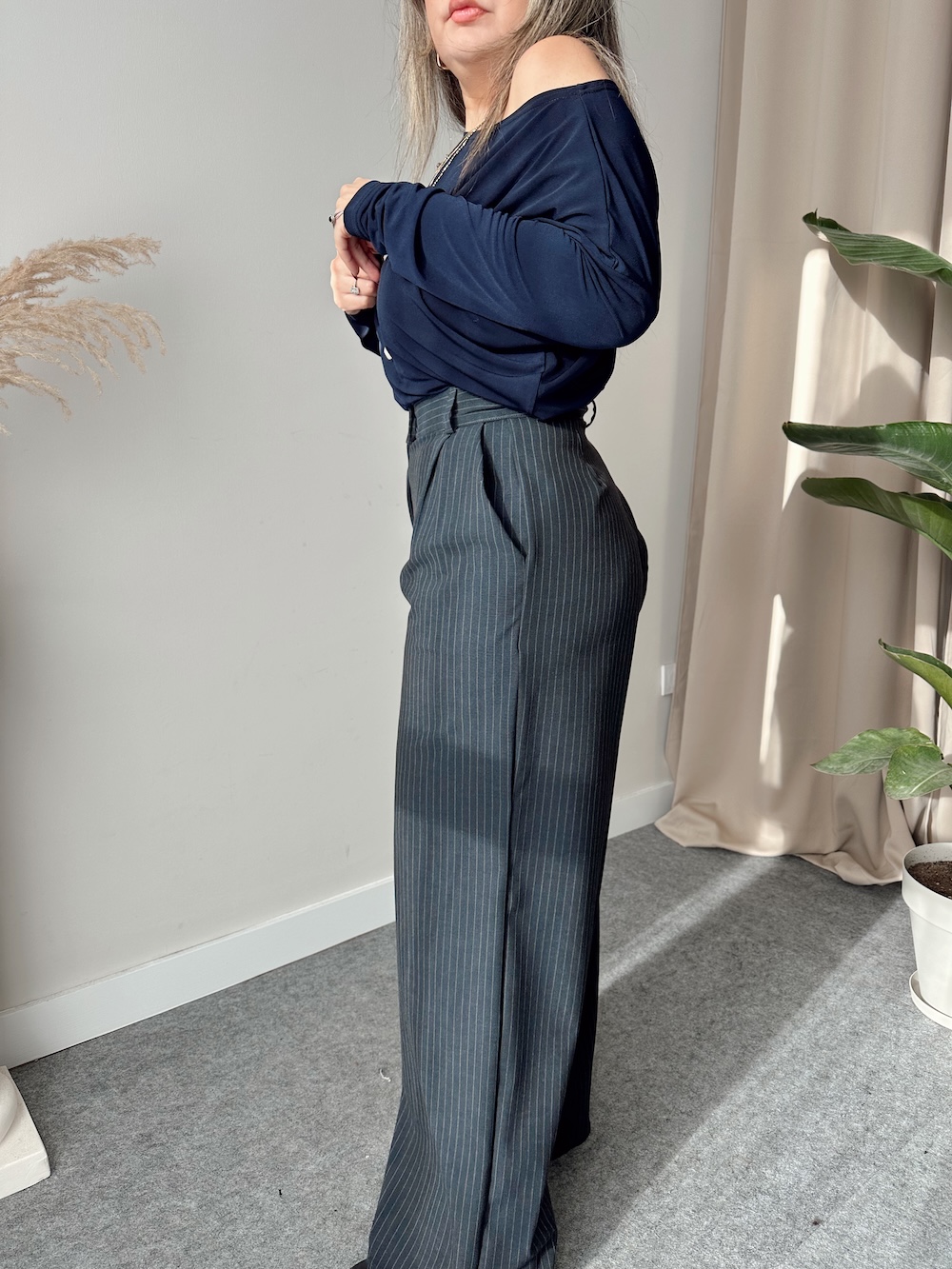 Lacivert Çizgili Premium Yün Karışımlı Pensli Palazzo Pantolon