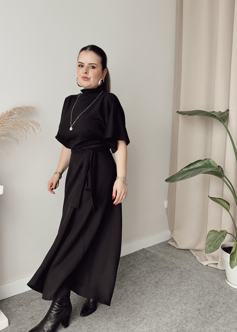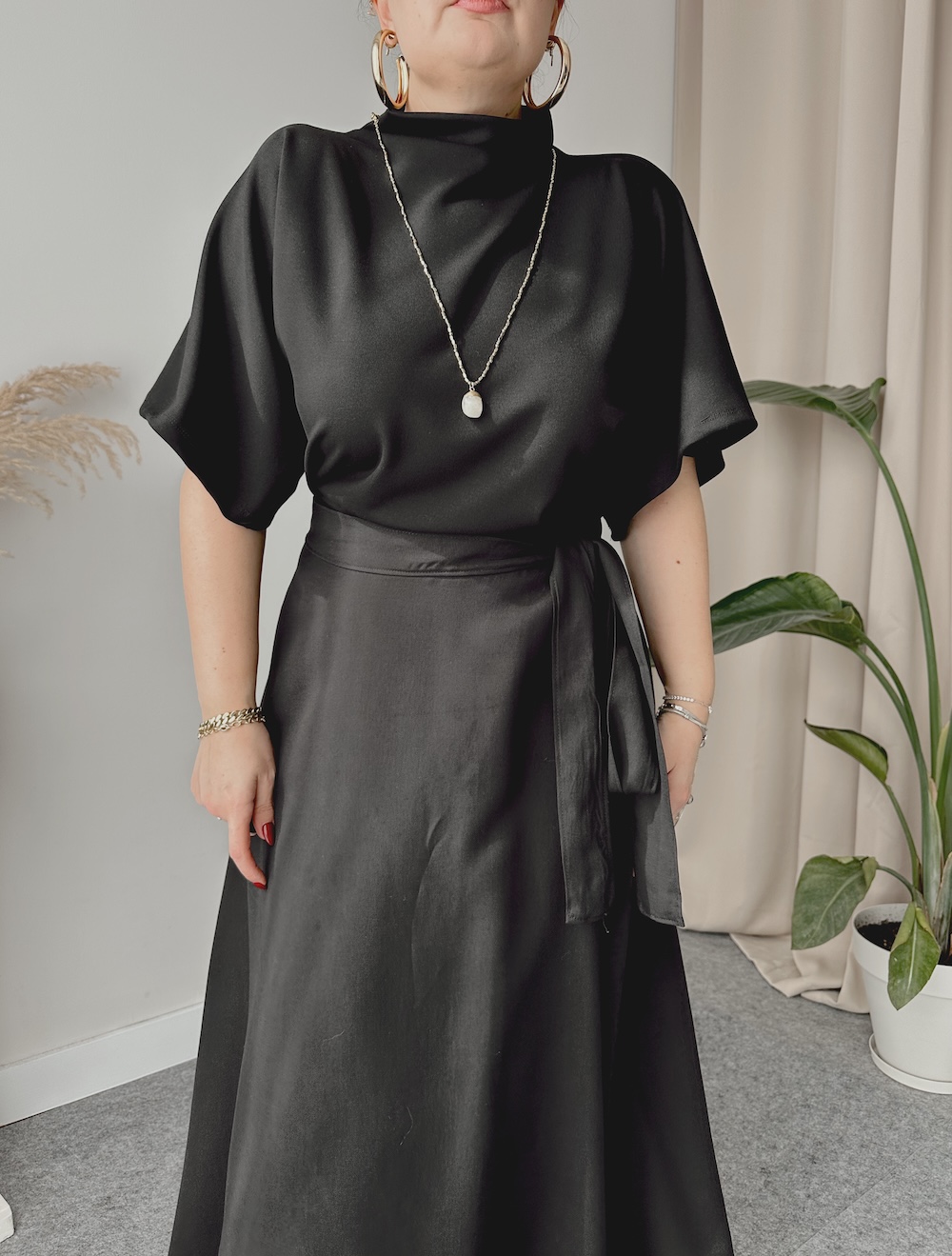 Siyah Çelik Dik Yaka Yarasa Kol Bluz