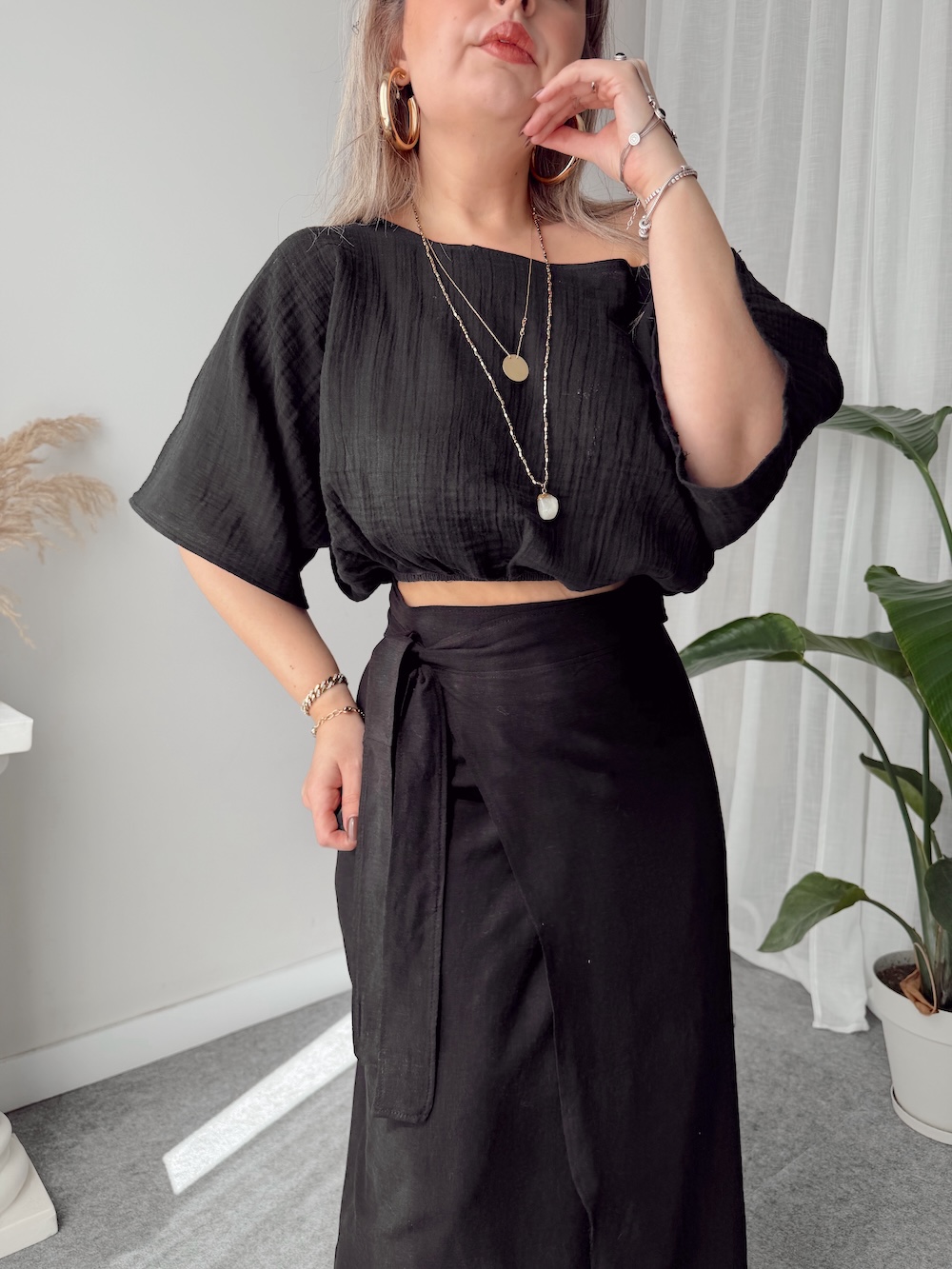 Siyah Müslin Kayık Crop Bluz